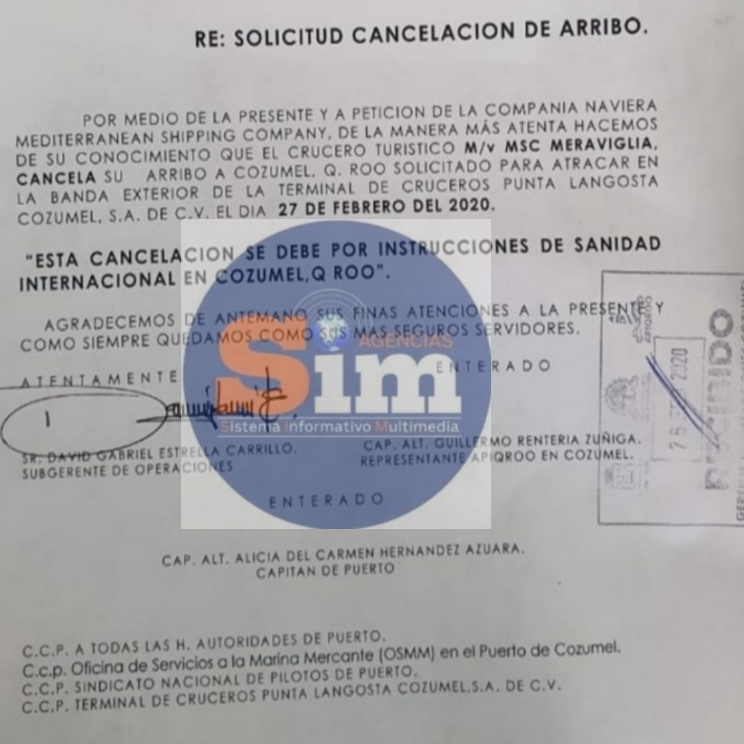 Cozumel.- Por medio de un oficio, Capitanía de Puerto informó que se canceló el arribo a Cozumel solicitado por el crucero MSC Meraviglia, por indicaciones de Sanidad Internacional. Este navío ya fue rechazado en dos puertos antes, por temor a que un tripulante enfermo tenga coronavirus.