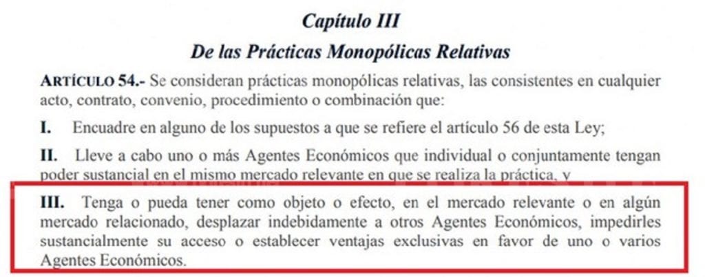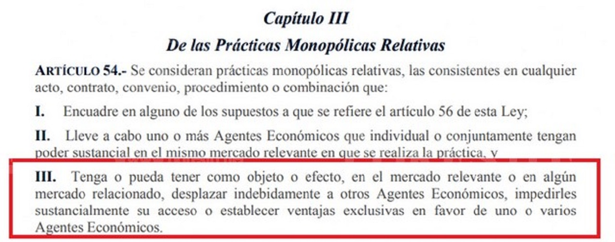 La misma Cofece indica en su artículo 54 referente a Prácticas Monopólicas Relativas que “Se consideran prácticas monopólicas relativas, las consistentes en cualquier acto, contrato, convenio, procedimiento o combinación que:” encuadren en tres puntos, ya no once como la antigua, pero en su tercer inciso define “Tenga o pueda tener como objeto o efecto, en el mercado relevante o en algún mercado relacionado, desplazar indebidamente a otros Agentes Económicos, impedirles sustancialmente su acceso o establecer ventajas exclusivas en favor de uno o varios Agentes Económicos”.