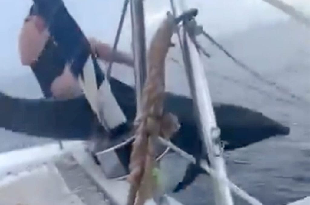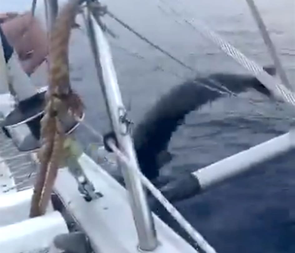 De repente, el animal saltó terminando dentro de la embarcación, para luego regresar al mar tras impactar en uno de los costados y tras una vuelta de 180 grados regresa con el lomo. La insólita escena quedó grabada en video por uno de los pasajeros.