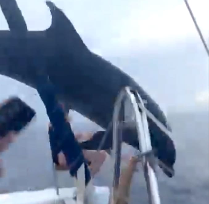 El turista que captó las imágenes compartió el archivo en las redes, donde se viralizó rápidamente. Al inicio se ve al delfín nadando a un costado del catamarán, así como el momento en que salta cayendo en la proa, a escasos centímetros de una turista que viaja sentada.