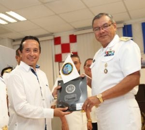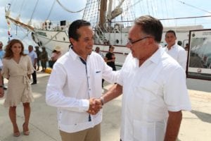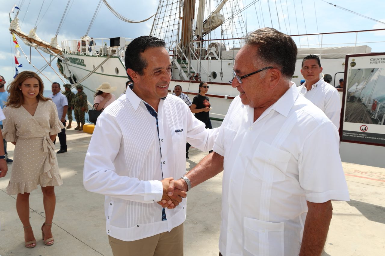 Carlos Joaquín, acompañado de mandos navales, encabezó la ceremonia de recepción destinada a los capitanes de las embarcaciones que arribaron hoy al Caribe mexicano procedentes de Santo Domingo, desde que zarparon de Brasil el pasado mes de abril para participar en una travesía de 157 días visitado puertos de Uruguay, Argentina, Chile, Perú, Ecuador, Panamá, Colombia, Venezuela, Curazao, República Dominicana y finalizarán en el estado de Veracruz.
