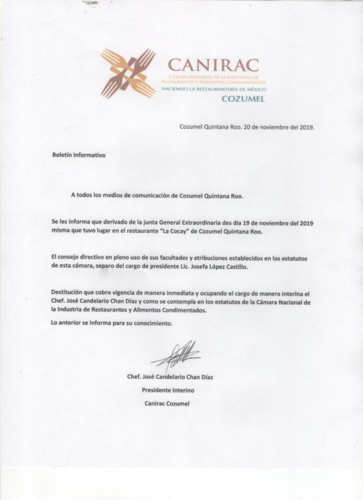 La Cámara Nacional de la Industria de Restaurantes de Alimentos Condimentados (Canirac) señaló en su comunicado que durante la Junta General Extraordinaria celebrada el día de ayer en el restaurante “Ña Cocay” de la isla, el Consejo Directivo en pleno uso de sus facultades y atribuciones establecidas en los estatutos de la cámara, decidió separar del cargo de presidente a Josefa López Castillo.