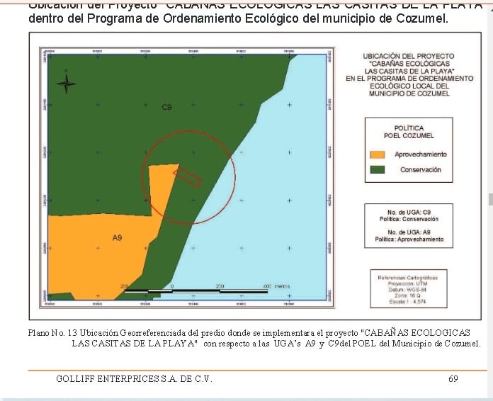 Citymar y los ambientalistas de Cozumel advirtieron a tiempo, pues según los documentos de “Golliff Enterprises S. de R. L. de C. V”, el proyecto pretende establecer tres cabañas ecológicas dotadas de servicios básicos y uso de energía verde (paneles solares y generadores eólicos). Se contará con acceso y algunas áreas de apoyo como son sanitarios, fosa séptica, cisterna, aguas residuales, cuarto de máquinas, áreas para estacionar vehículos y andadores.