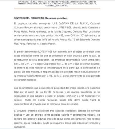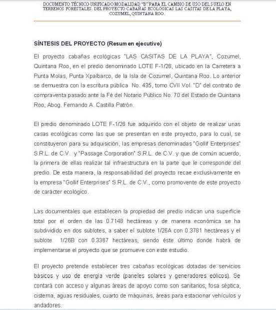 Pero esa cabaña es la “punta del iberg”, pues el proyecto solicitado por la empresa “Golliff Enterprises S. de R. L. de C. V”, originaria de Estados Unidos, pero con sede en Mérida, Yucatán, se refiere a “tramitar de manera conjunta ante la Semarnat, el cambio de uso del suelo en terrenos forestales de acuerdo a los establecido en la Ley General de Desarrollo Forestal Sustentable y la Ley General del equilibrio Ecológico y Protección al Ambiente, para el proyecto cabañas ecológicas ‘Las Casitas de la Playa’, Cozumel, Quintana Roo”, con una inversión de 3 millones de pesos.