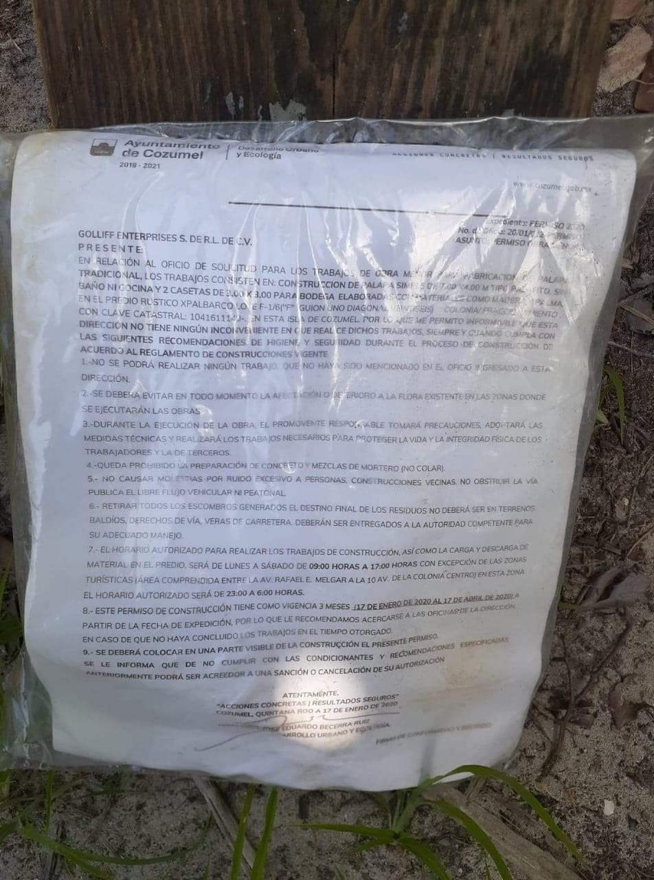 Ante esta solicitud, la Dirección de Becerra Ruiz contestó con el número de oficio 20/01/02/PERMISO; donde se le dice al solicitante que en relación al permiso para la “fabricación de una palapa tradicional”, con una longitud de 7 metros de lago por 4 metros de ancho. Dicha obra no contará con baños y cocina, pero si con la construcción de dos casetas de 3 por 3 metros que serán utilizadas para bodega.