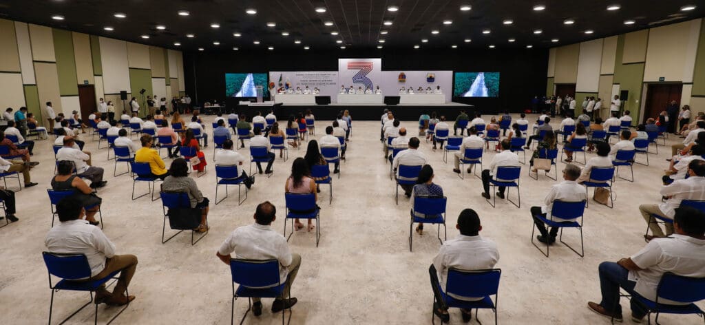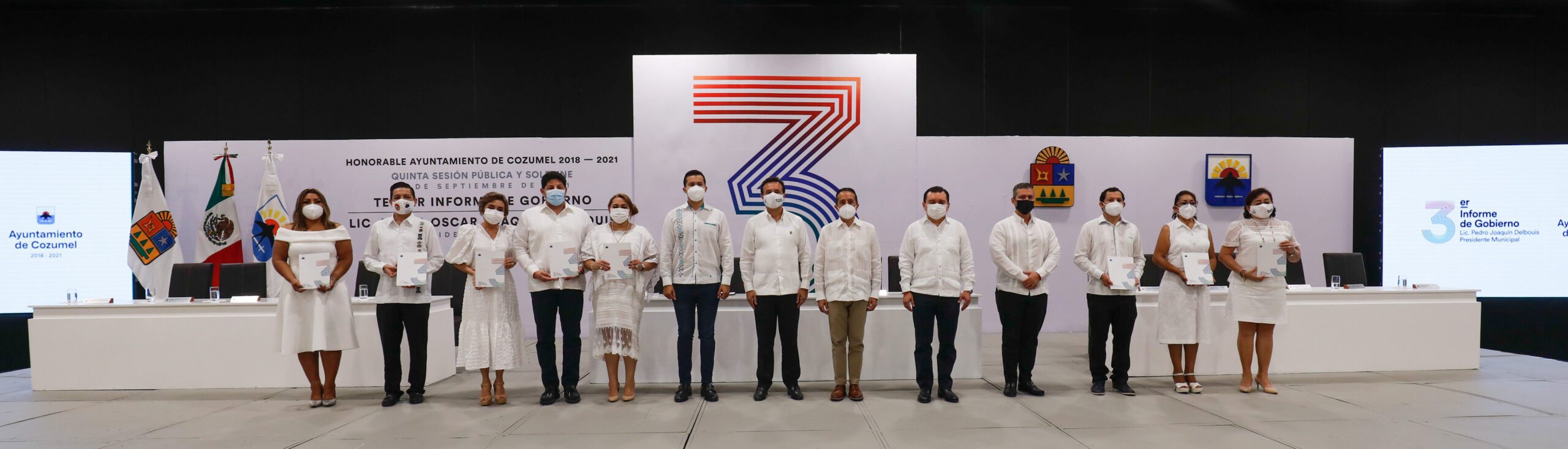 Cozumel, Quintana Roo a 14 de septiembre del 2021.— Hoy entregamos un municipio con bases sólidas para seguir creciendo, afirmó el Presidente Municipal, Pedro Joaquín Delbouis, durante la Quinta Sesión Pública y Solemne de Cabildo, al rendir su Tercer Informe de Gobierno, en el que destacó que deja una administración con finanzas sanas, un Cozumel seguro, con atención y servicios públicos, con reactivación económica y turística real, y subrayó que durante la pandemia se tomaron decisiones oportunas que salvaron vidas.