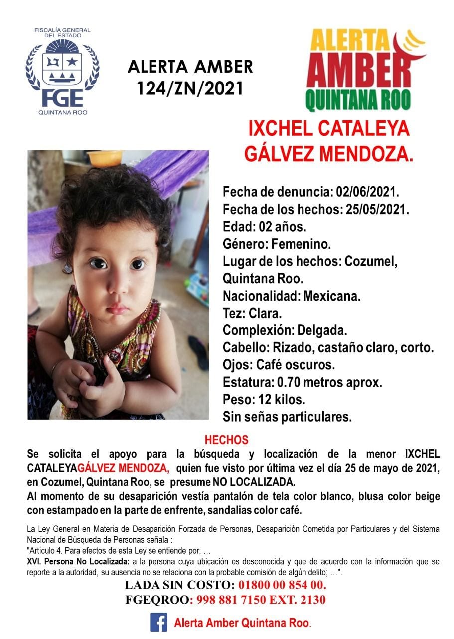 Cozumel.- “Estoy destrozada, no sé qué pasó””, afirma Isabel Mendoza, madre quien clama por ayuda para localizar a su hija de dos años, de nombre Ixchel, desaparecida desde el pasado 25 de mayo, cuando le fue entregada a su papá, con quien no convivía desde hace unos ocho meses.