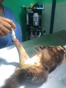 Gracias al apoyo del Centro Médico Veterinario (CMV), el coatí fue atendido de inmediato, le hicieron estudios y radiografías para determinar que sufrió una fractura distal de tibia y ulma en la pata posterior derecha, por lo que el veterinario Julio Gutiérrez Cetina, asistido por la médico veterinario zootecnista Edith Ochoa y la anestesista Zuleyka Bosque, procedieron a realizar una cirugía para atender la herida, informó el biólogo Rafael Chacón Díaz, director de CEA.