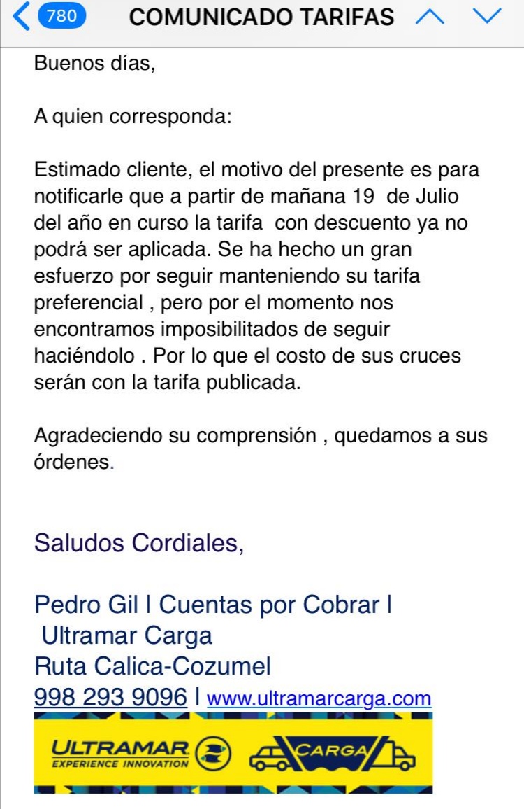 Pulido Zavala detalló que ambas navieras les enviaron un comunicado donde les informaban que que a partir de esta semana ya no habría descuentos; el transporte que se mueve hoy en Cozumel depende totalmente del servicio de las navieras, les genera una derrama económica importante.