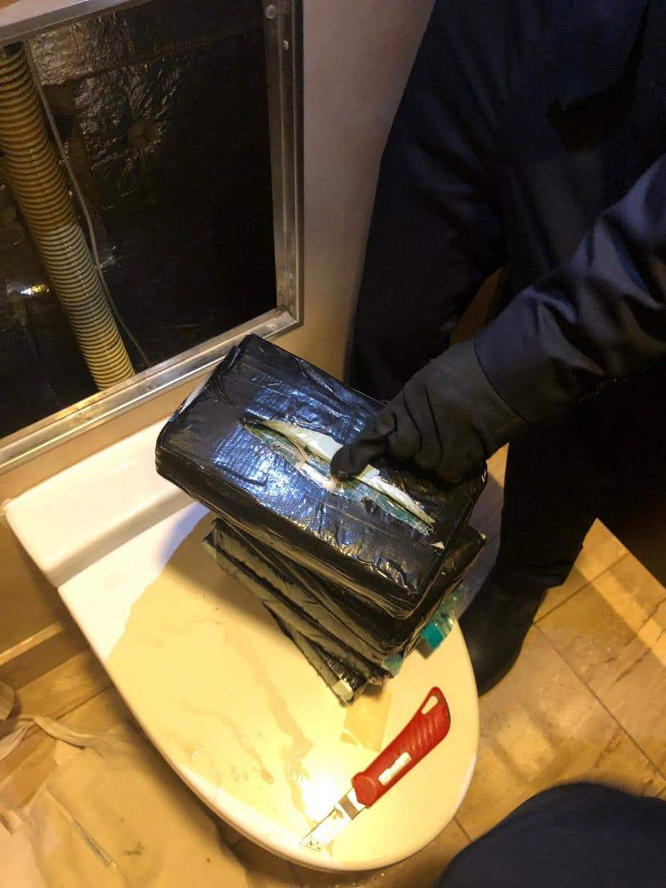 En la revisión en el navío constataron la existencia de seis paquetes encintados con lo que parece ser cocaína, al interior de un baño.