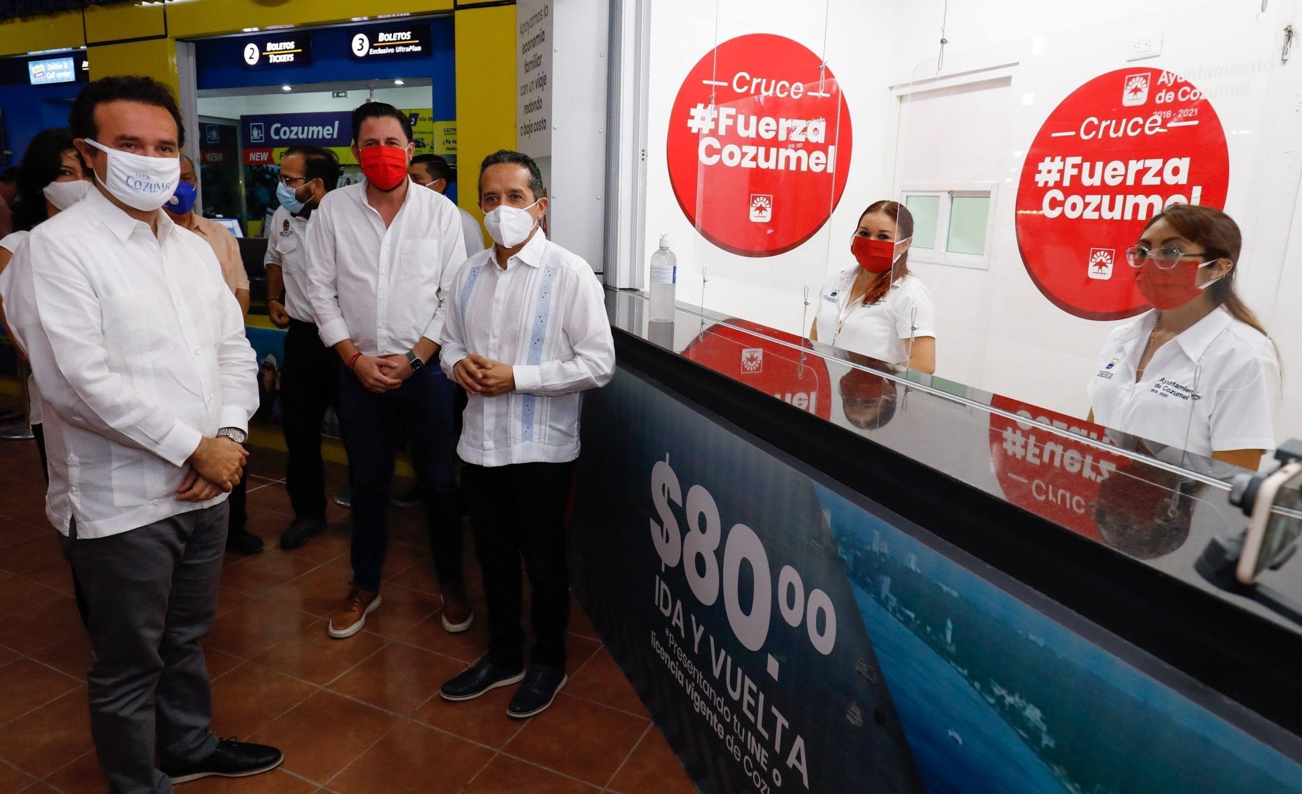 Pedro Joaquín Delbouis y el Gobernador, Carlos Joaquín González, visitaron el módulo ubicado en las instalaciones del muelle San Miguel, donde se venderán los boletos a partir del martes 16 de marzo próximo, con el apoyo de la Administración Portuaria Integral de Quintana Roo (Apiqroo).