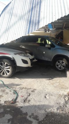 Para su mala suerte, el tinglado también se impactó contra otra camioneta que estaba en el interior del autolavodo; ahora el lavador de autos tendrá que pagar una deuda que se estima en 50 mil pesos en daños, todo por tratar de impresionar a su jefe.