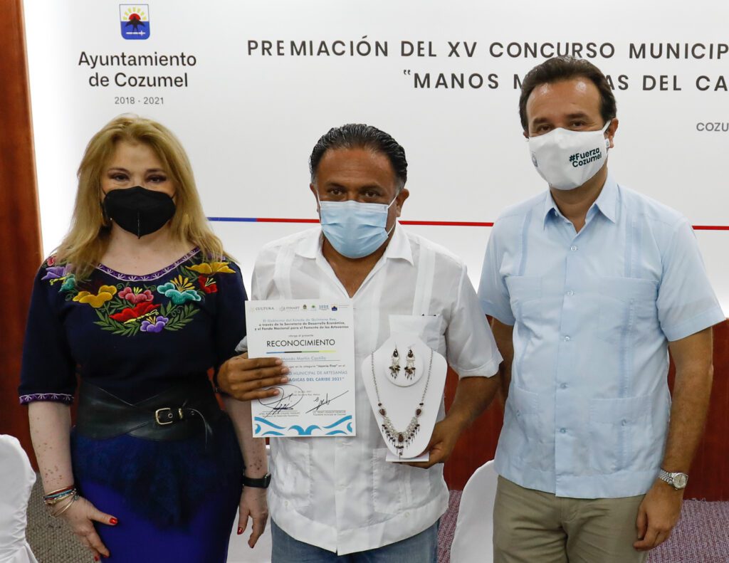 Cozumel, Quintana Roo.-El Presidente Municipal, Pedro Joaquín Delbouis, entregó reconocimientos a los ganadores del XV Concurso Municipal de Artesanías “Manos Mágicas el Caribe 2021”, con el fin de reconocer e impulsar el trabajo de los artesanos de la isla.