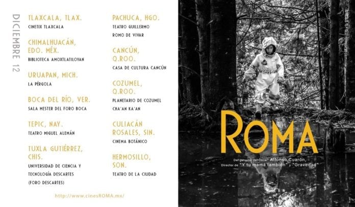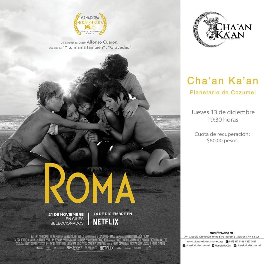 Cozumel.- La multi premiada película de Alfonso Cuarón que obtuviera el “León de Oro” en el Festival de Cine en Venecia por ser la “Mejor Película” entre muchos más, se proyectará por único día este jueves en el Planetario de Cozumel a las 7:30 de la noche, previo a su lanzamiento el viernes en una plataforma de transmisión digital de películas.