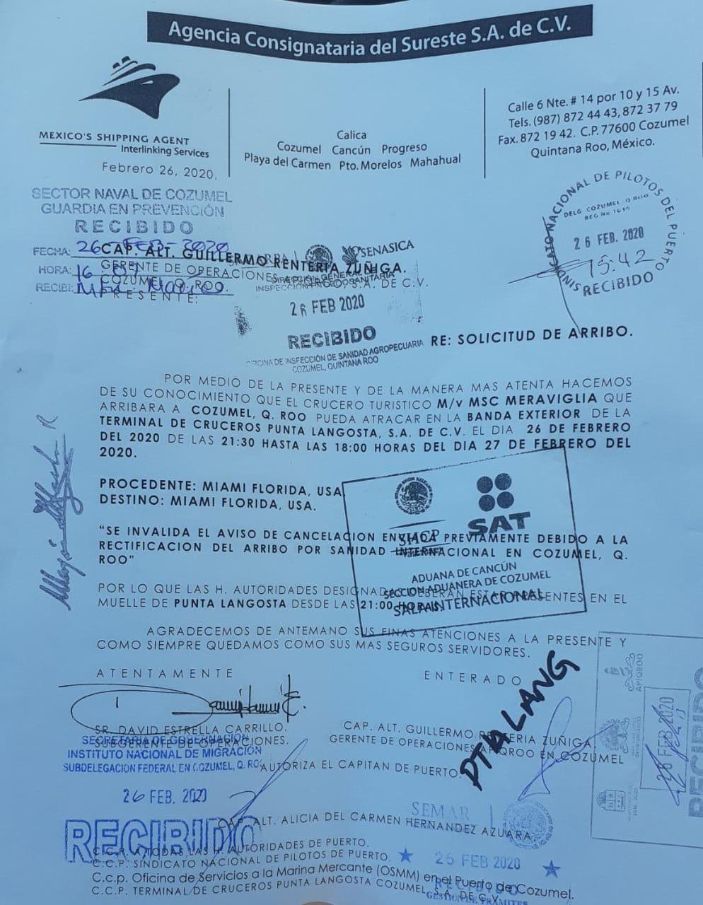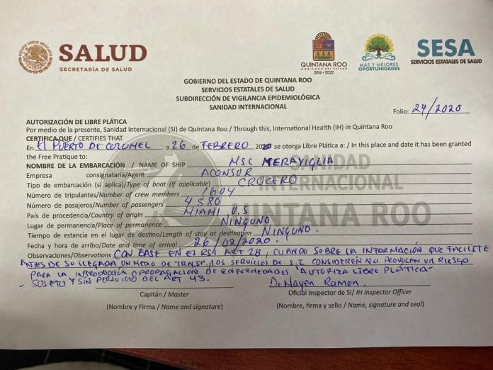 La embarcación ya cuenta con la venia de esta dependencia, parte de la Secretaría de Salud, como consta en un documento oficial, además de ser confirmado por la titular de la Sesa, Alejandra Aguirre Crespo, y el presidente municipal de Cozumel, Pedro Joaquín Delbouis.