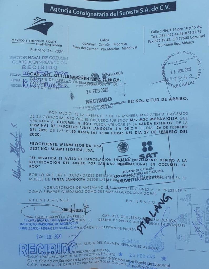 Cozumel.- El crucero MSC Meraviglia sí atracará esta noche en Cozumel, pudiendo sus pasajeros desembarcar sin ningún impedimento, a pesar de la filtración previa de un oficio en que se indicaba que se cancelaba este arribo, por órdenes de Sanidad Internacional.