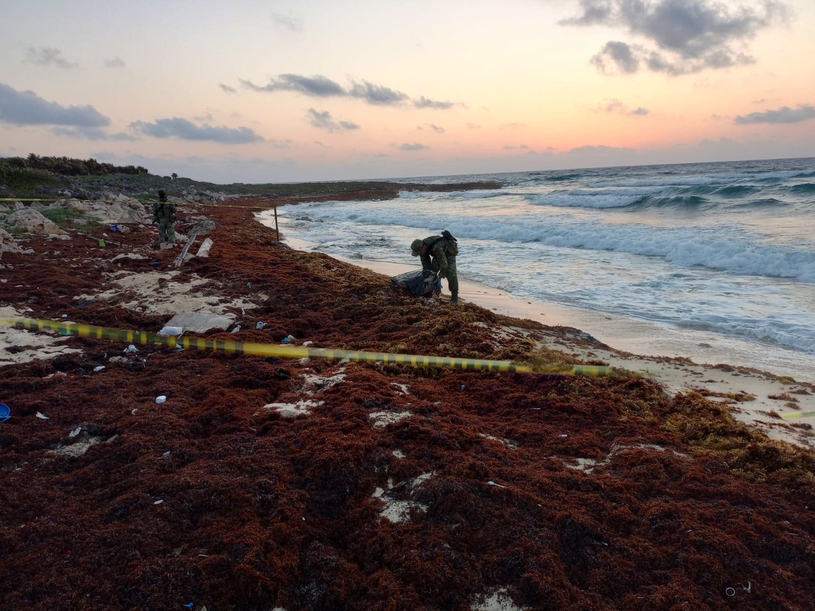 Además, personal del Ejército Mexicano recorre a pie las costas del lado oriental de la isla en busca de recales, principalmente en esta temporada de arribo de sargazo, cuando el oleaje favorece el recale de esta macroalga y otros objetos a las costas.