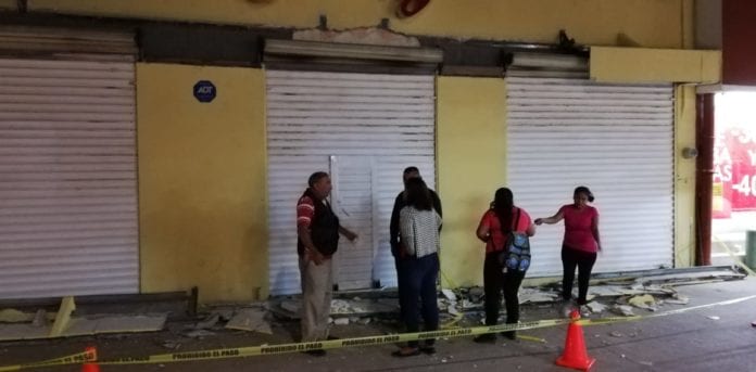 Cozumel.- Cae parte del techo de plafón y concreto (volado) de la fachada de la tienda de ropas Melody en pleno centro de la isla. En el lugar había transeúntes, pero ninguno fue golpeado. Incluso, junto a la tienda había un puesto de comida, pero todos los comensales alcanzaron a retirarse a tiempo.