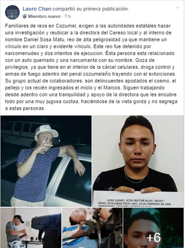 Cozumel.- A través de las redes sociales circula información que indica que la directora del Centro de Readaptación Social (Cereso) de Cozumel, Ana Laura Jaimes García, mantiene una relación sentimental con el interno de nombre Daniel Sosa Matu, quien es un peligroso reo que fue detenido por narcomenudeo y dos intentos de ejecución.
