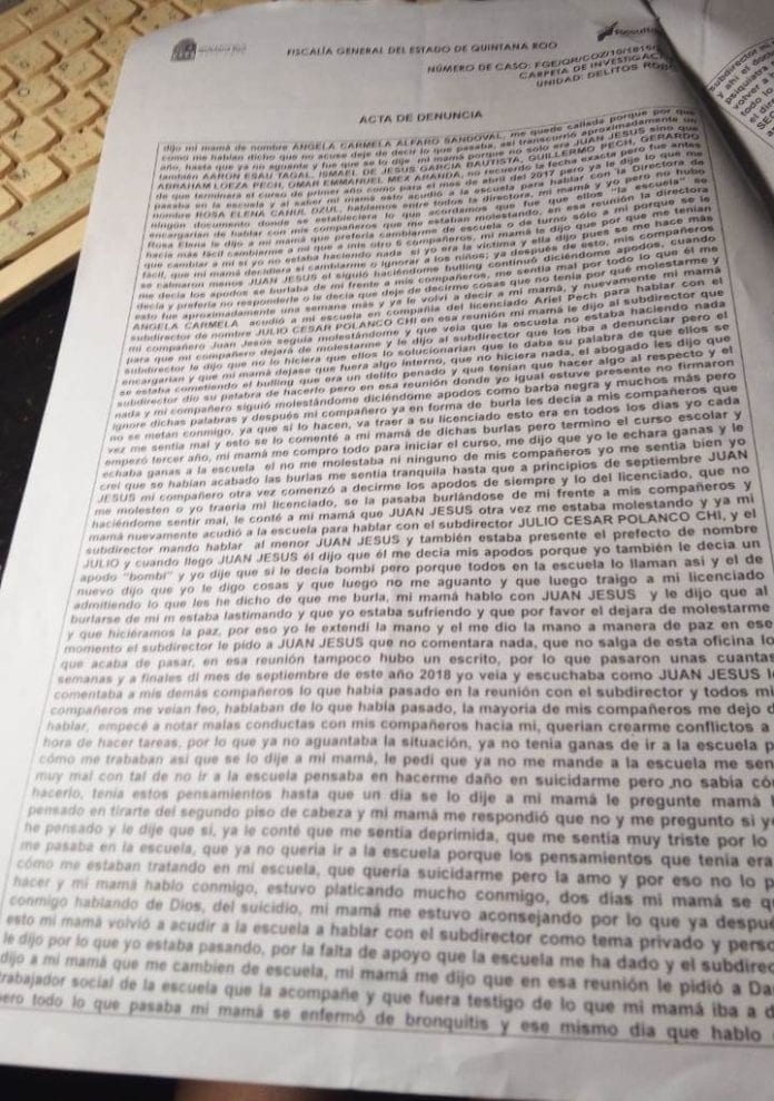 Narró que en la secundaria técnica José Vasconcelos, la directora Rosa Elena Canul Dzul, le dijo que era más fácil cambiar a su hija que a los seis estudiantes, quienes la acosaban psicológicamente todos los días desde que cursaba el primer grado.