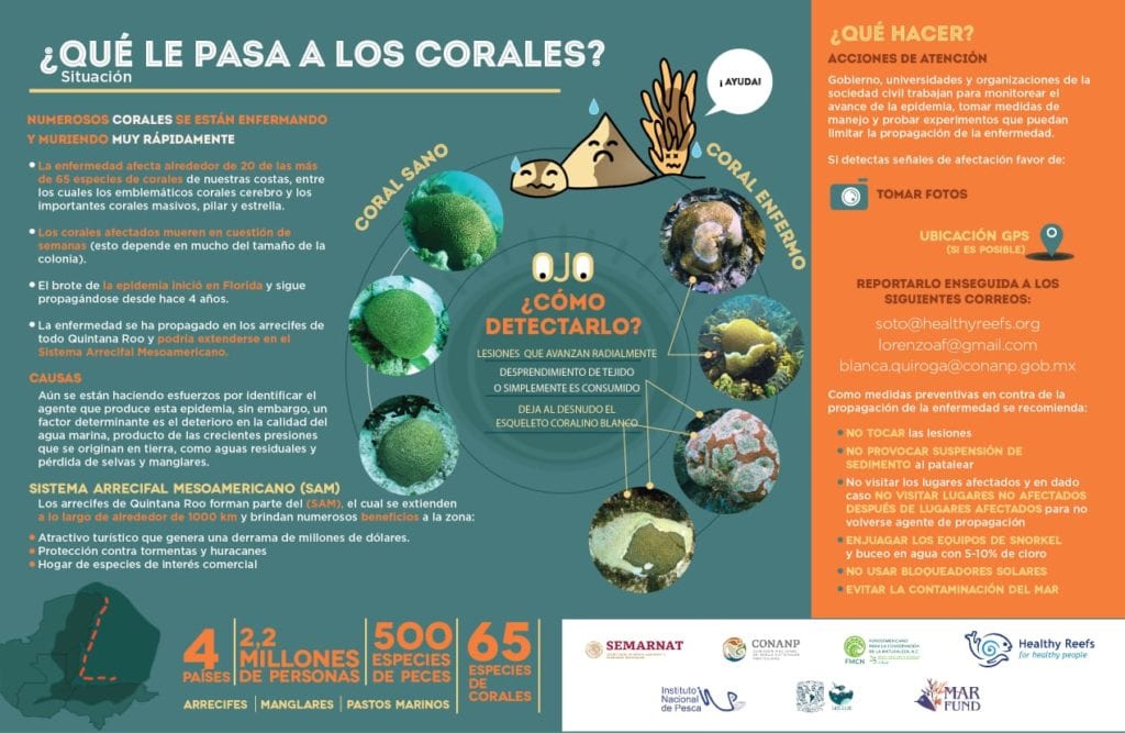 Es de suma importancia que los operadores turísticos, manejadores de los recursos naturales y la sociedad en general estén muy atentos y se detengan a observar los corales. Si un sitio presenta señales de afectación, favor de tomar fotos, si es posible con ubicación GPS o indicar el nombre del arrecife, y reportarlo enseguida a los correos blanca.quiroga@conanp.gob.mx; lorenzoaf@gmail.com de la UNAM o soto@healthyreefs.org de HRI.