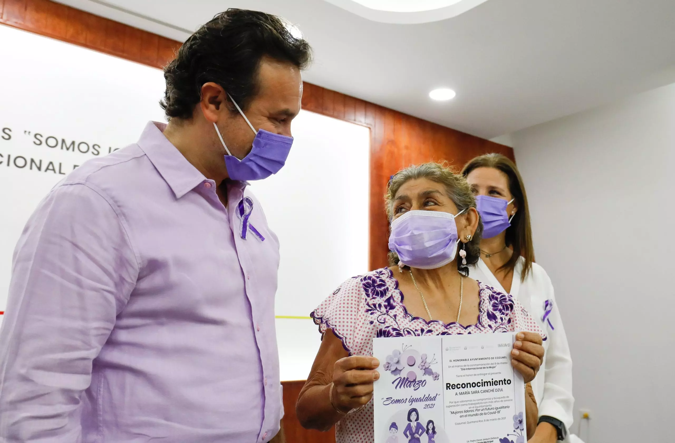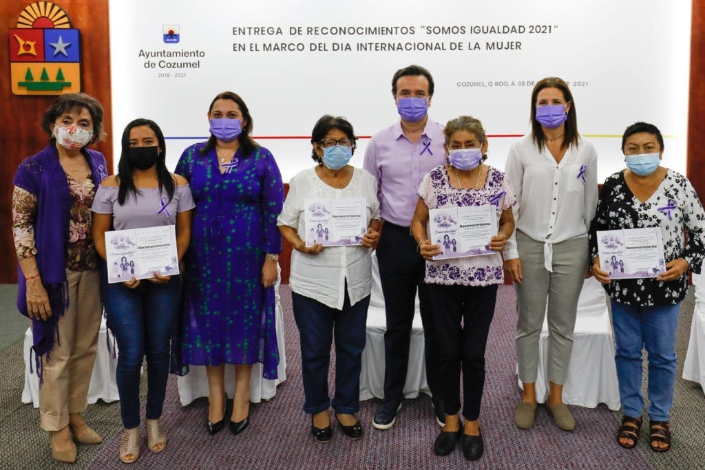 El Presidente Municipal reiteró su reconocimiento y respaldo a las mujeres de México, Quintana Roo, y Cozumel con motivo del Día Internacional de la Mujer, decretado en los 70’s por la ONU, motivo por el cual,  previo al programa #PlatiquemosJuntos, entregó los reconocimientos “Somos Igualdad 2021”, a cuatro mujeres que han aportado al desarrollo de Cozumel: Alicia Chuc Canché, María Meléndez Kumul, María Canché Dzul y Laura Durán Xool, y destacó la importancia de fortalecer la cultura de respeto hacia las mujeres.