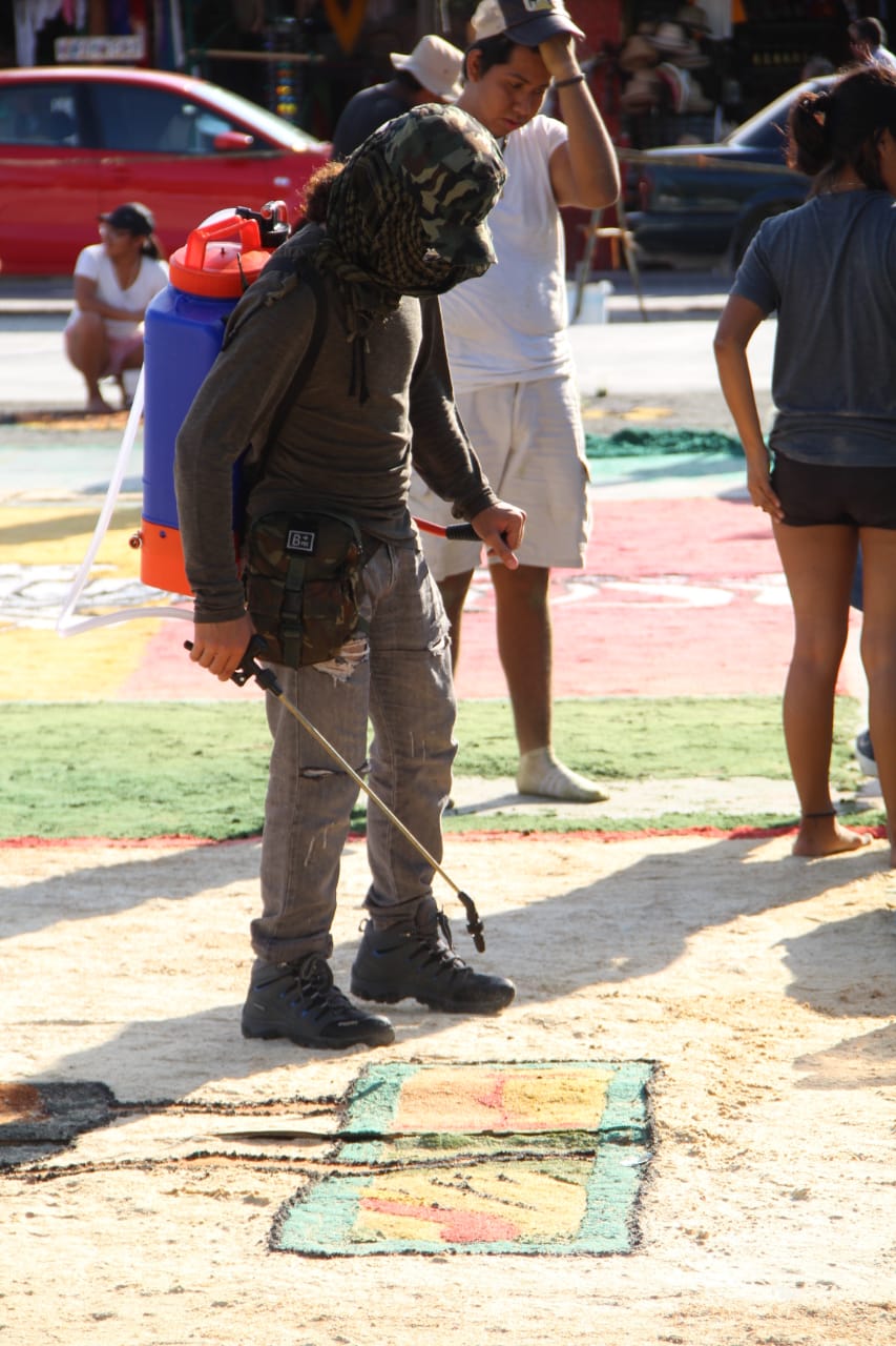 La preparación de la tonelada y media de aserrín y su teñido fue una labor que tomó tres días, en tanto que la creación del tapete mismo lleva dos días y todavía ignoran si quedará completo a tiempo para su inauguración, esta tarde a las 18 horas.