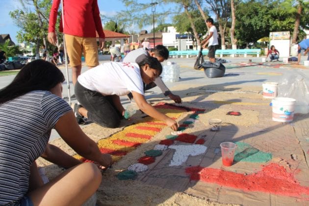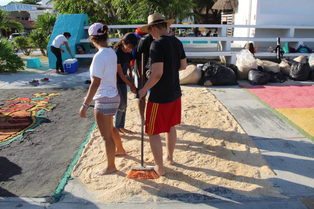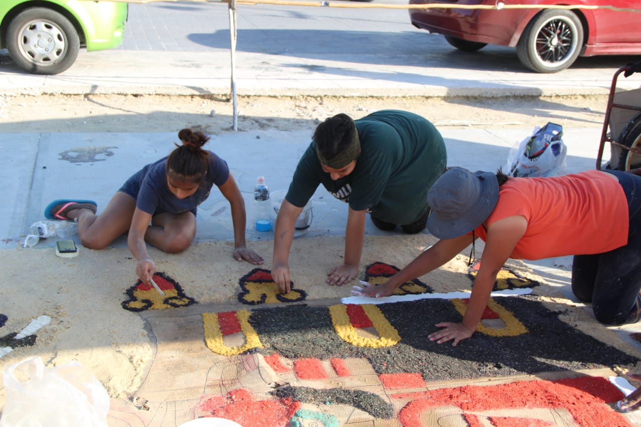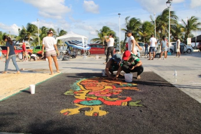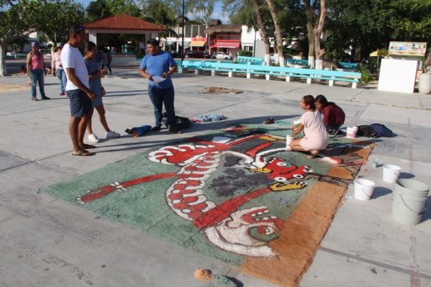 Puerto Morelos.- Un tapete prehispánico de aserrín, de 40 metros de largo por 20 de ancho, es construido por alumnos voluntarios en la cancha principal del parque del casco antiguo de esta cabecera municipal, con pasajes de los códices mayas y aztecas, en donde se muestran los dioses del inframundo.