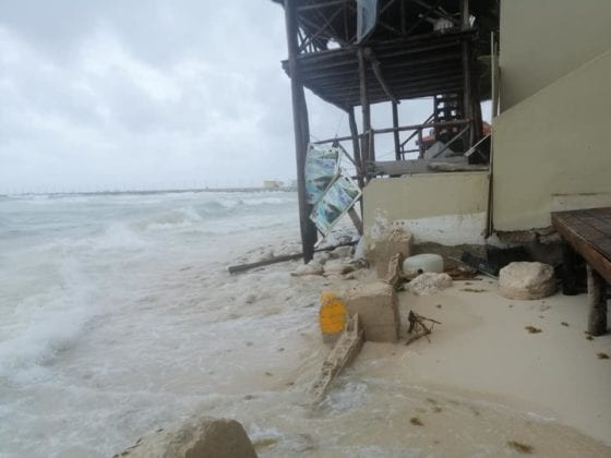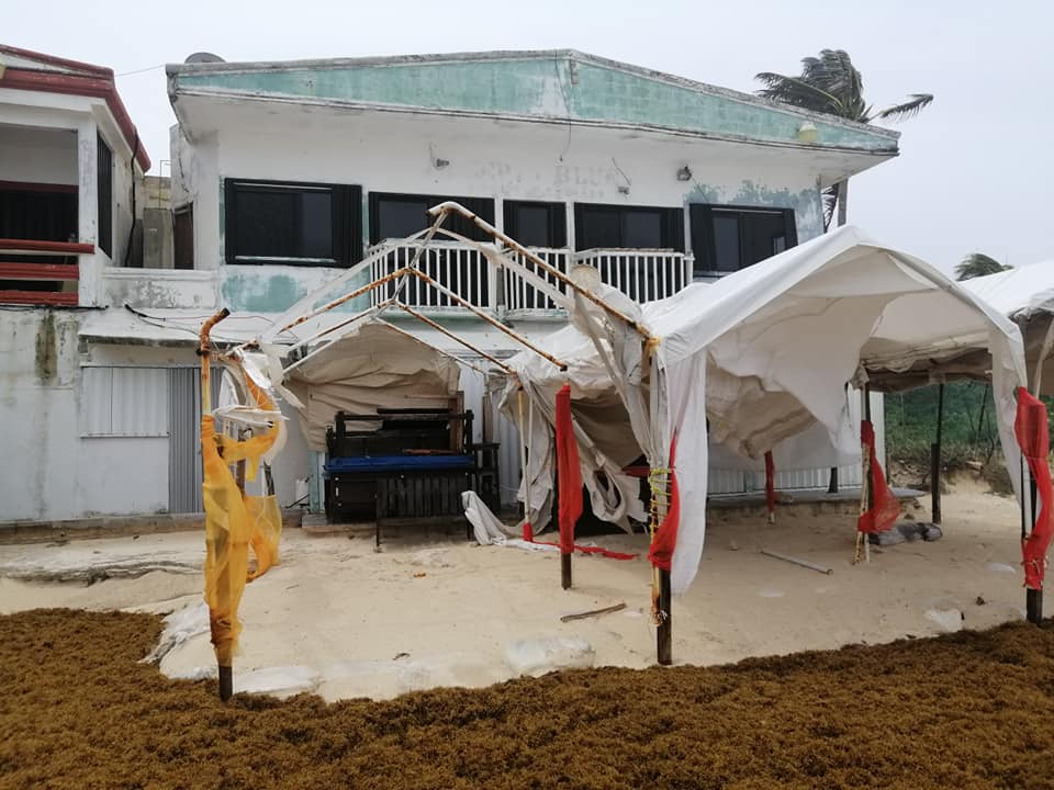 Al llevarse las olas la arena de la playa, una palapa y gran parte de este local quedó prácticamente rodeado por el agua, deslavándose los cimientos y quedando toda la estructua en riesgo de colapso.