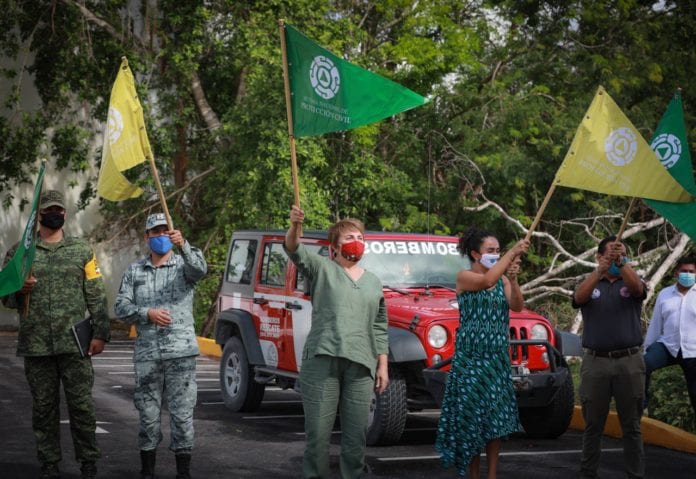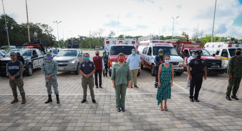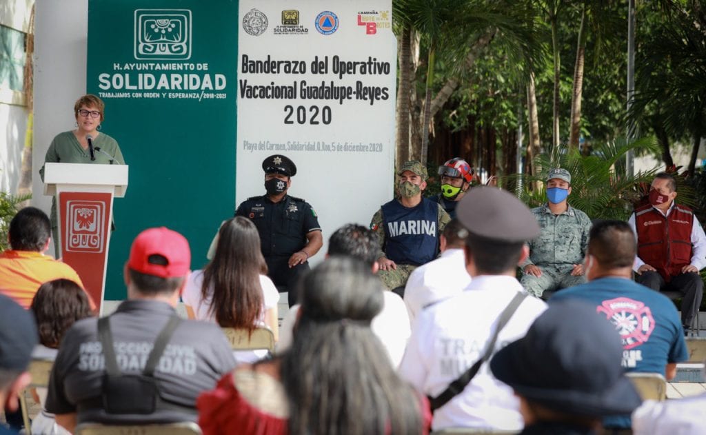 Playa del Carmen, Solidaridad, a 5 de diciembre del 2020.- Con la presencia de titulares y representantes de las corporaciones de seguridad pública de los tres niveles de gobierno -Guardia Nacional, Bomberos, cuerpos de emergencias y Protección Civil-, la presidenta municipal, Laura Beristain Navarrete, dio el banderazo de inicio del “Operativo Vacacional Guadalupe-Reyes 2020”, donde participan más de mil elementos para reforzar la seguridad, atención a los turistas y la ciudadanía en general.