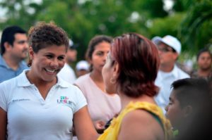 Playa del Carmen.- La candidata de la coalición Todos por México a diputada federal por el Distrito 01, Leslie Hendricks Rubio, recibió el respaldo y muestras de apoyo de cientos de habitantes de la colonia Ejidal, ante quienes se comprometió a cumplir su palabra de otorgar becas escolares a estudiantes de escasos recursos.