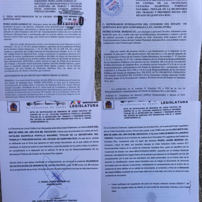 Chetumal.- El ex presidente de la Junta Local de Conciliación y Arbitraje interpuso una denuncia en contra de la secretaria de Trabajo y Previsión Social, Catalina Portillo Navarro, además de solicitar un juicio político en su contra ante el Congreso del Estado. El ex funcionario la acusa de haber usurpado funciones al destituirlo en septiembre de 2016.