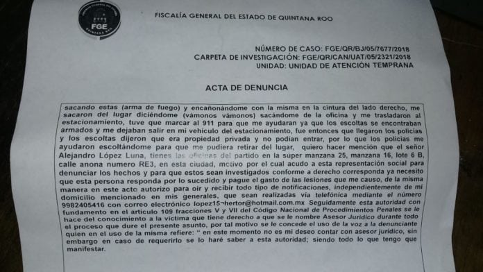 De acuerdo con la denuncia interpuesta por el quejoso, Héctor Eluid Dávila Alpuche, de 27 años de edad, los hechos ocurrieron el 31 de mayo en las instalaciones del partido en la avenida Tulum, donde se realizó una reunión de trabajo con el equipo.