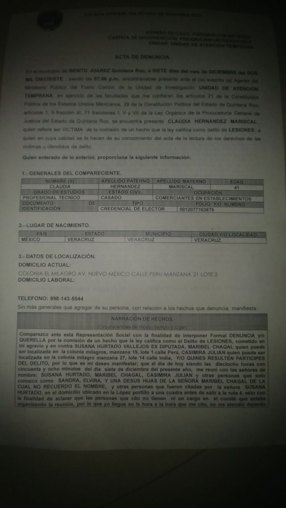 De acuerdo con el acta de denuncia, número de caso FGE/QR/BJ/12/1B279/2017, expuso que, como miembro de un comité de mujeres dedicadas al comercio, fue citada a  reunión  a partir de las 18 horas por Susana Hurtado, en la calle India de la referida colonia.