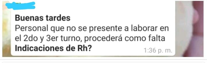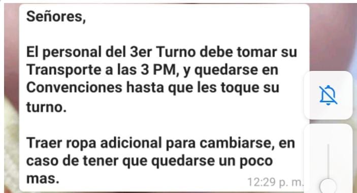 “Señores, personal del tercer turno debe tomar su transporte a las 3 PM y quedarse en Convenciones hasta que les toque su turno. Traer ropa adicional para cambiarse, en caso de tener que quedarse un poco más”, es el mensaje supuestamente enviado por la empresa a través de WhatsApp a sus colaboradores.