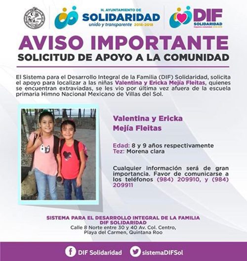 Playa del Carmen.- Dos niñas, de ocho y nueve años, fueron localizadas por agentes de la Policía Federal en Campeche, horas después de que las reportaran como desaparecidas el fraccionamiento Villas del Sol de Playa del Carmen, cuando iban rumbo a la escuela.