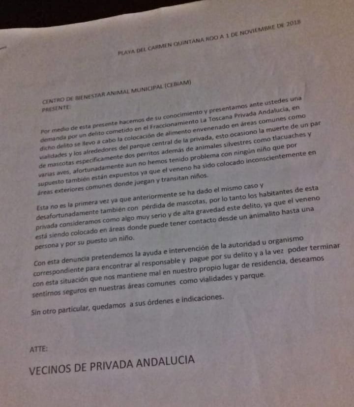“Por medio de esta presente hacemos de su conocimiento y presentamos ante ustedes una demanda por un delito cometido en el Fraccionamiento La Toscana Privada Andalucía, en dicho delito se llevo a cabo la colocación de alimento envenenado en áreas comunes como vialidades y los alrededores del parque central de la privada, esto ocasiono la muerte de un par de mascotas específicamente dos perritos además de animales silvestres como tlacuaches y varias aves, afortunadamente aun no hemos tenido problema con ningún niño que por supuesto también están expuestos ya que el veneno ha sido colocado inconscientemente en áreas exteriores comunes donde juegan y transitan niños.