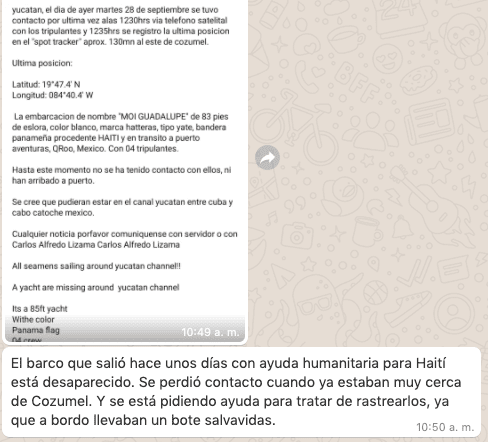Fue el 28 de septiembre cuando se tuvo contacto telefónico por última ocasión con los tripulantes, teniendo como última posición en el ‘spot tracker’ al este de Cozumel.