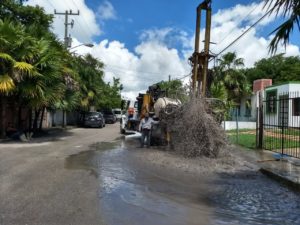 Puerto Morelos.- Con el objetivo de mitigar los encharcamientos y posibles inundaciones en la cabecera municipal, personal de Servicios Públicos del Ayuntamiento llevó a cabo este sábado el desazolve de pozos de absorción y la limpieza de areneros en diversos puntos de la localidad.