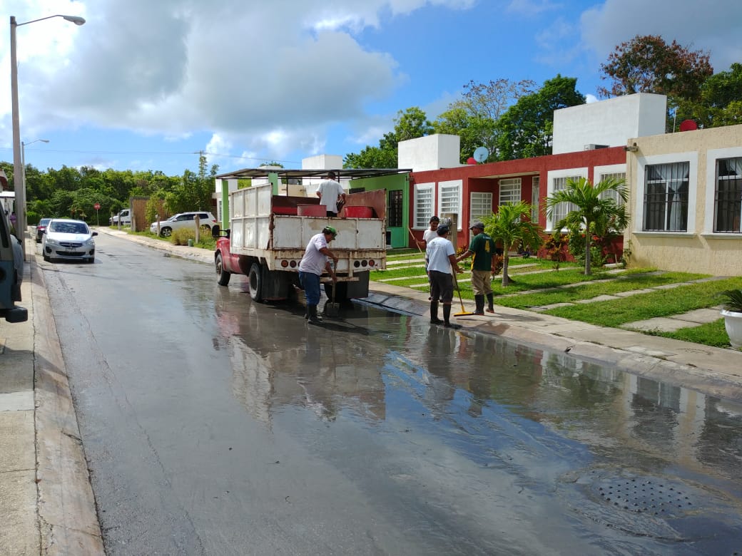 Puerto Morelos.- Con el objetivo de mitigar los encharcamientos y posibles inundaciones en la cabecera municipal, personal de Servicios Públicos del Ayuntamiento llevó a cabo este sábado el desazolve de pozos de absorción y la limpieza de areneros en diversos puntos de la localidad.