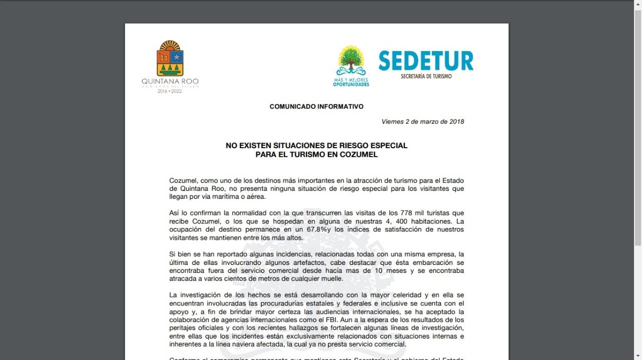 “La investigación de los hechos se está desarrollando con la mayor celeridad y en ella se encuentran involucradas las procuradurías estatales y federales e inclusive se cuenta con el apoyo y, a fin de brindar mayor certeza las audiencias internacionales, se ha aceptado la colaboración de agencias internacionales como el FBI. Aun a la espera de los resultados de los peritajes oficiales y con los recientes hallazgos se fortalecen algunas líneas de investigación, entre ellas que los incidentes están exclusivamente relacionados con situaciones internas e inherentes a la línea naviera afectada, la cual ya no presta servicio comercial”, detalló en su escrito.