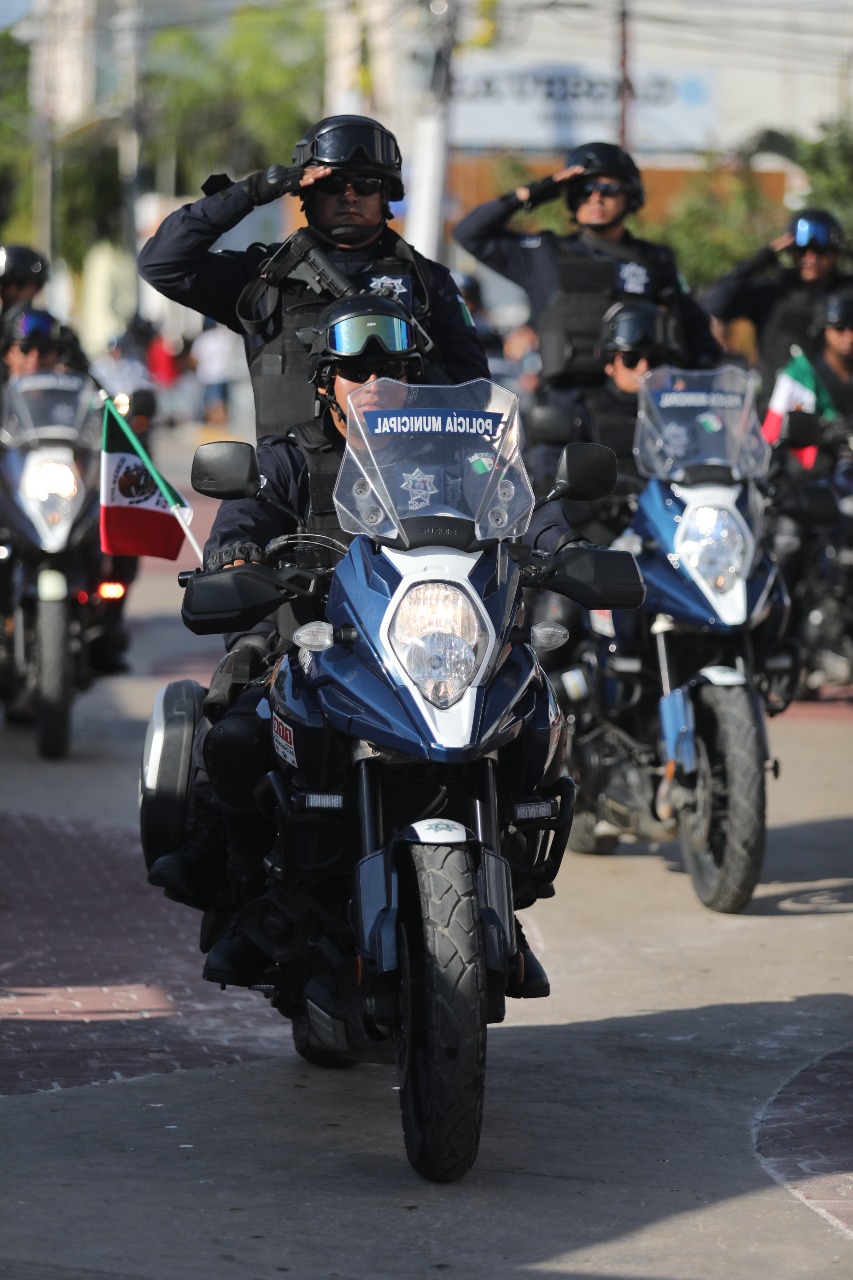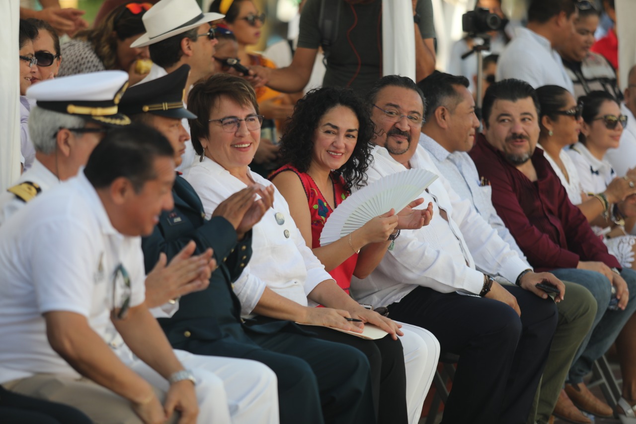 La presidenta municipal, acompañada por los integrantes del Cabildo, miembros de su gabinete, así como invitados especiales, entre ellos los representantes de la Secretaría de la Defensa Nacional, la Marina, la Guardia Nacional, la Policía Federal y Estatal, saludaban a los participantes, quienes desde temprana horas del día se dieron cita en la unidad deportiva Mario Villanueva para realizar el tradicional desfile que culminó frente al palacio municipal.