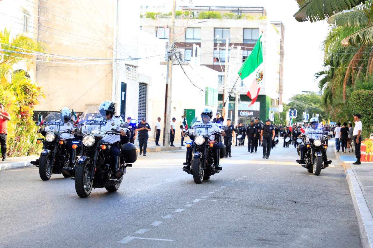 En el marco de la Conmemoración del CCIX Aniversario de la Independencia de México, este día marchó un nutrido contingente integrado por poco más de 3 mil personas, como parte del tradicional desfile cívico-militar que fue muy aplaudido por los solidarenses y visitantes extranjeros, así como por las autoridades municipales encabezadas por la presidente municipal Laura Beristain Navarrete, quien saludó con entusiasmo a todos los integrantes de los 49 bloques que marcharon frente a palacio municipal, lugar donde la munícipe exhortó a los presentes a conocer la historia que hizo de México, lo que es hoy.