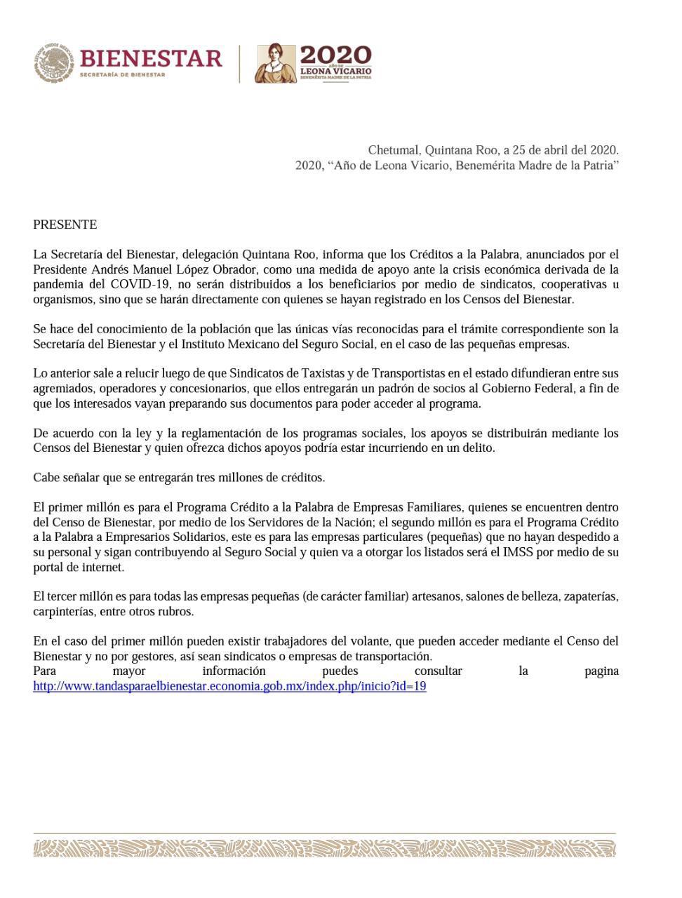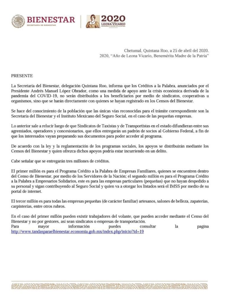 Playa del Carmen.- A través de un escrito, la Secretaría del Bienestar aclaró que los créditos a la palabra que repartirá el Gobierno Federal en respuesta por la actual emergencia sanitaria los entregarán de manera directa, desmintiendo de esta manera las solicitudes de los sindicatos de taxistas de la entidad para que sus agremiados acudieran con ellos para apuntarse por uno.
