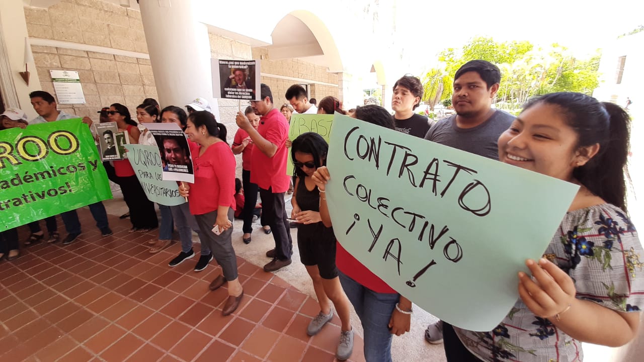 Chetumal.- Portando mantas y cartulinas con distintos “memes” en los que se critica al rector saliente, Ángel Rivero Palomo, trabajadores de la Universidad de Quintana Roo, adscritos a su sindicato, se congregaron para exigir un cambio total en la directiva, ahora que entra el nuevo rector, Francisco López Mena, quien llegó al poco tiempo.