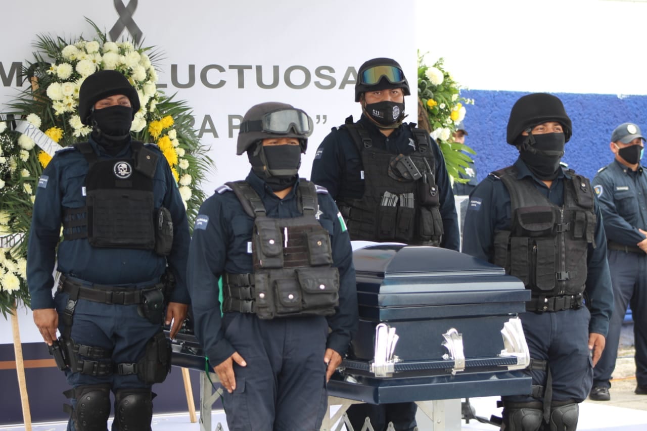 Cancún.- Con la presencia de la presidenta municipal de Benito Juárez, Mara Lezama; el secretario estatal de Seguridad Pública, Alberto Capella Ibarra; autoridades civiles y policiacas de los tres órdenes de gobierno, así como la familia del difunto, se realizó el homenaje póstumo a cuerpo presente de Carmen Guerra Pinto, policía asesinado hace dos días en esta ciudad.