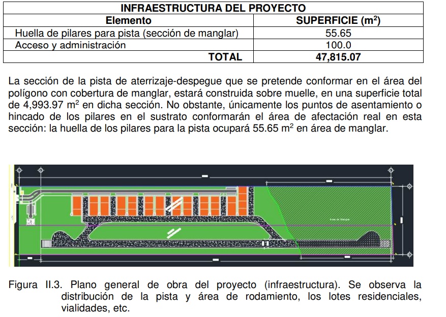 La pista de aterrizaje tendría 812 metros de longitud, de los que una sección estaría en tierra firme y el resto de forma elevada, sobre pilotes, estar por encima de una zona de manglar junto a la playa.