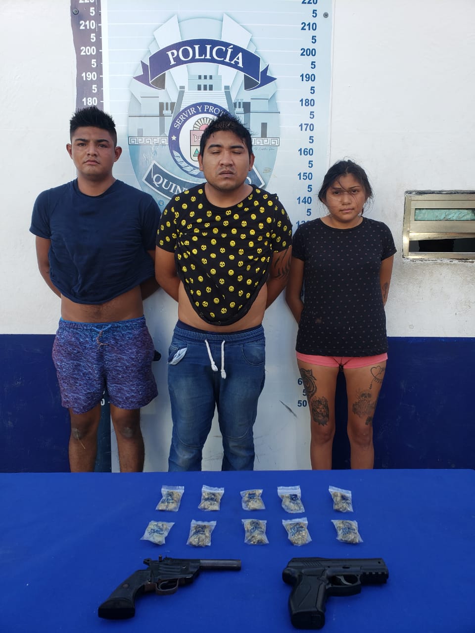 Detenidos resultaron Guillermo S. N., de 23 años de edad, originario de Campeche; Édgar Eduardo R. G., de 27 años de edad, originario de Chetumal; y Katia Merari C. T., de 22 años de edad, originaria de Yucatán (estos últimos dos pareja). Todos son residentes de Cancún.