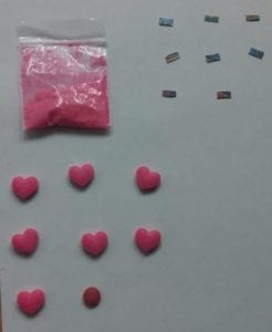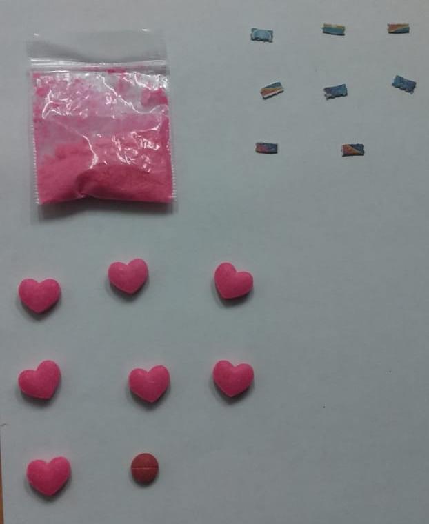 Al ser registrados, a los sujetos se les encontró una bolsa con polvo rosa, presuntamente cocaína, ocho trozos de papel, al parecer LSD, siete pastillas en forma de corazón y una pastilla roja. Los tres hombres fueron arrestados y trasladados a la corporación para los fines legales correspondientes.
