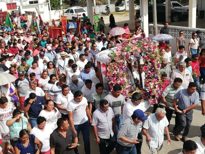 En medio de un sofocante calor, los creyentes marchaban con estandartes, rudas y veladores. Como es costumbre, los sacerdotes Enrique Cauich Tah y José Fernando Baas Tuz realizaban rezos en lengua materna en cada esquina.